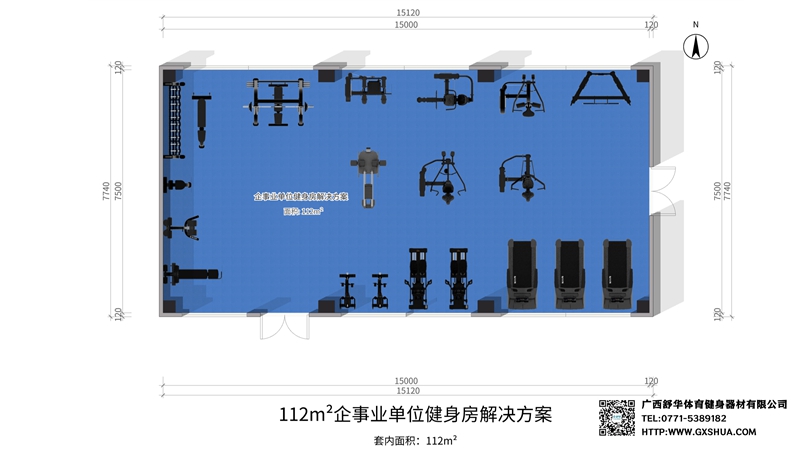 此方案要求面积小于112m²,适用于企事业单位、酒店会所、楼盘社区、学校、商用健身房等健身场所,能满足20-30人同时健身使用。(方案根据场地空间大小、预算、产品需求等进行配置仅为启发性参考)